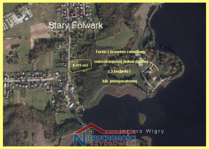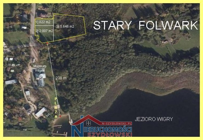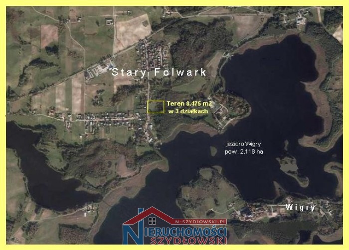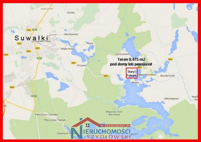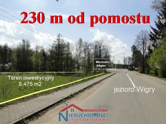 Nieruchomość gruntowa o powierzchni 8.475 m2, w skład której wchodzą przyległe do siebie 3 działki o powierzchni: 1] 822 m2, 2] 2.007 m2 i 3] 5.646 m2. Nieruchomość położona w centrum tej turystycznej miejscowości, zaledwie 230 m od jeziora Wigry. Od zachodu i południa graniczy z publiczną drogą asfaltową. Wszystkie media przy drodze. Suwałki 10 km.