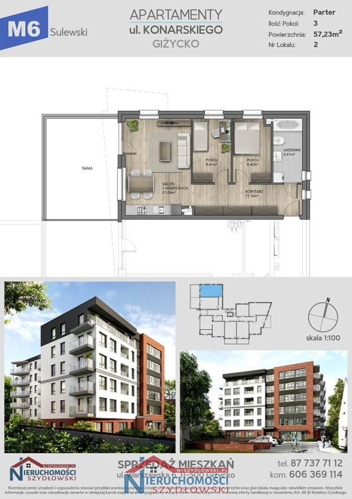 Lokal mieszkalny nr 2 położony na parterze o pow. 57,23 m2, 3 pokoje (w tym 1 z aneksem kuchennym), łazienka, przedpokój oraz taras. Istnieje możliwość nabycia miejsca postojowego (ilość ograniczona) w garażu podziemnym w cenie 35.000,00 zł. Cena mieszkania nie obejmuje ceny miejsca postojowego. Miejsce postojowe nie jest obowiązkowe.