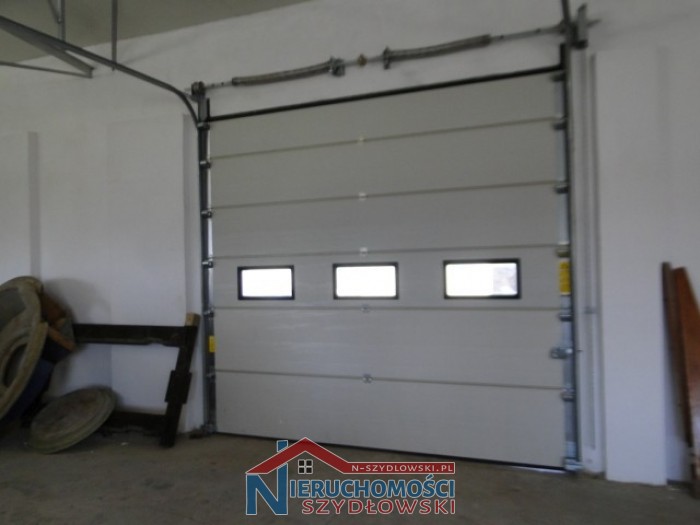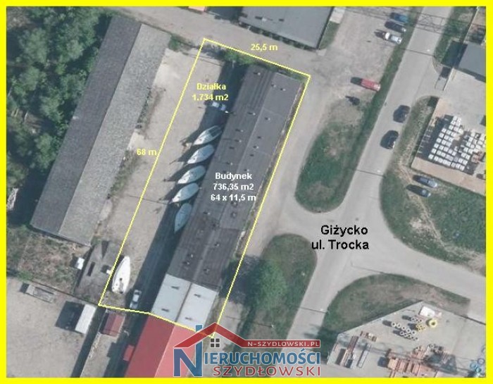 Do wynajęcia nieruchomość, w skład której wchodzi budynek usługowo-magazynowo-produkcyjny o pow. 736,35 m2 oraz działka o pow. 1.734 m2 (68 m x 25,5 m). W budynku dwa pomieszczenia o pow. 616,75 m2 (53,63 m x 11,50 m) oraz o pow. 119,60 m2 (10,40 m x 11,50 m) i wysokości 3,40 m mierzonej od podłogi do wiązarów. Do większego pomieszczenia prowadzi pięć bram wjazdowych i troje drzwi wejściowych, zaś do mniejszego jedna brama i drzwi (pokazane na schemacie). Podłogi przystosowane do obciążeń i wózków widłowych.